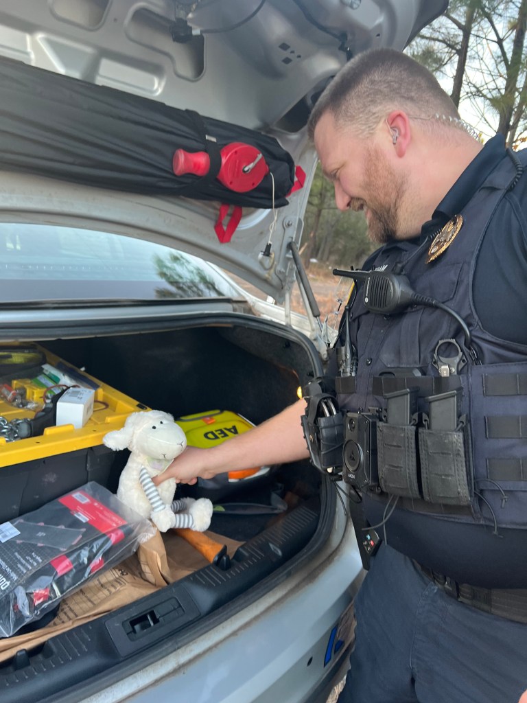 Sergeant Carl Mitcham – buzz-cut blond, blue-eyed, tall – checks over the supplies in the back of his police car in the parking lot of the nondescript police station. First aid materials. A surgical gown. A stuffed animal for the kids. An ax.